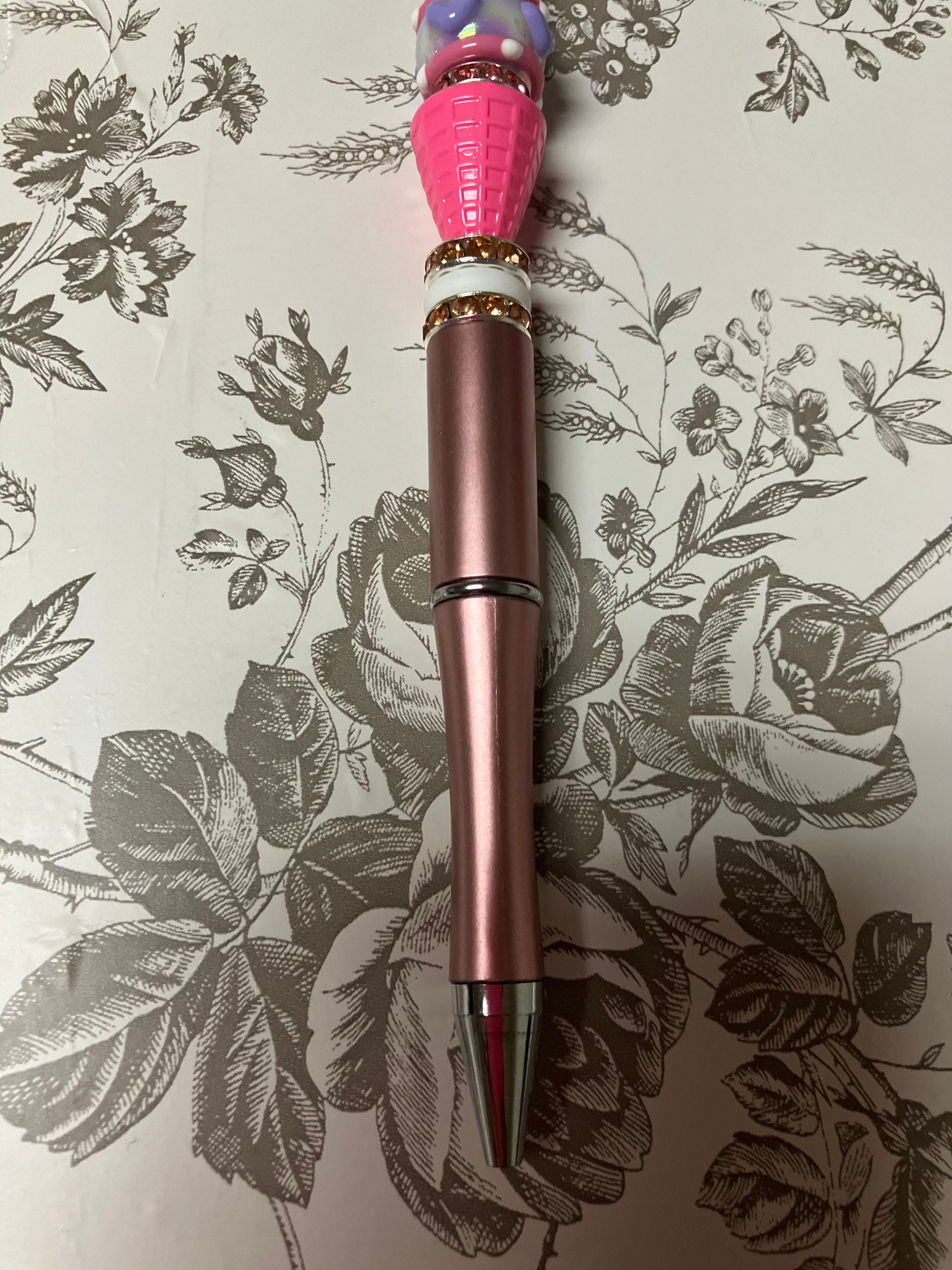 Hand painted acrylic beaded ice cream with a lot of sparkle with a pink cone. All pens come with a refillable ink stick.
